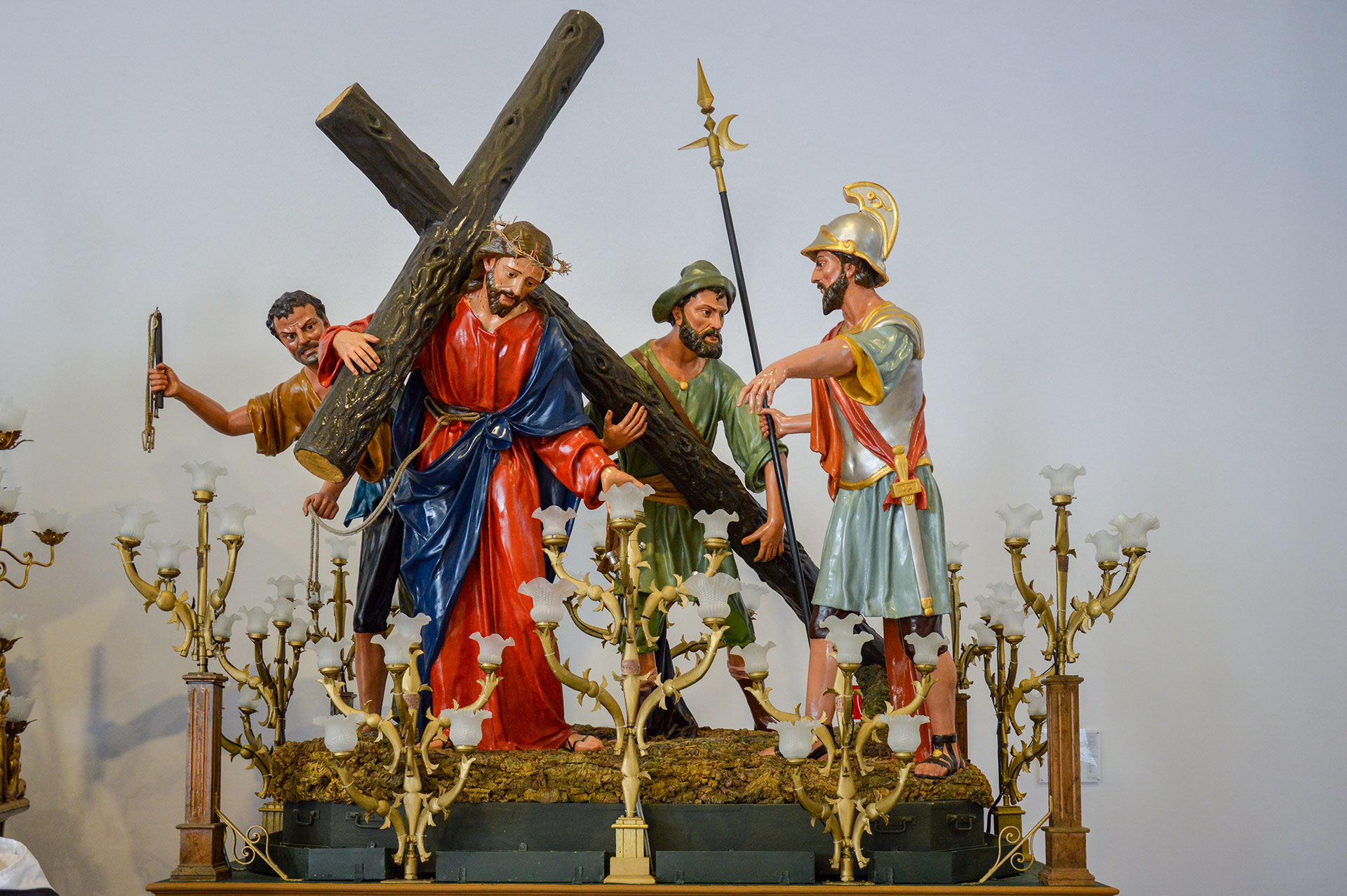 La vara, commissionata dal ceto dei “gessai” e oggi appartenente agli eredi della famiglia Cannarozzo, fu realizzata nel 1886 da Francesco e Vincenzo Biangardi. Presenta dimensioni di circa 2,85 × 1,95 × 3 metri.La scena raffigura l’incontro tra Gesù e Simone di Cirene, il contadino costretto ad aiutarlo nel trasporto della croce. Il gesto di Simone, carico di umanità e compassione, si contrappone alla durezza del contesto.Il Cristo, sollevato per un attimo dal peso del legno, sembra rivolgere a Simone un gesto di silenziosa benedizione. In netto contrasto con questa scena di pietà, emergono le figure del soldato romano e dell’uomo con la sferza, i cui atteggiamenti duri e autoritari accentuano la tensione drammatica dell’insieme.L’opera esprime così un forte dualismo tra misericordia e crudeltà, rendendo la rappresentazione particolarmente intensa e coinvolgente.