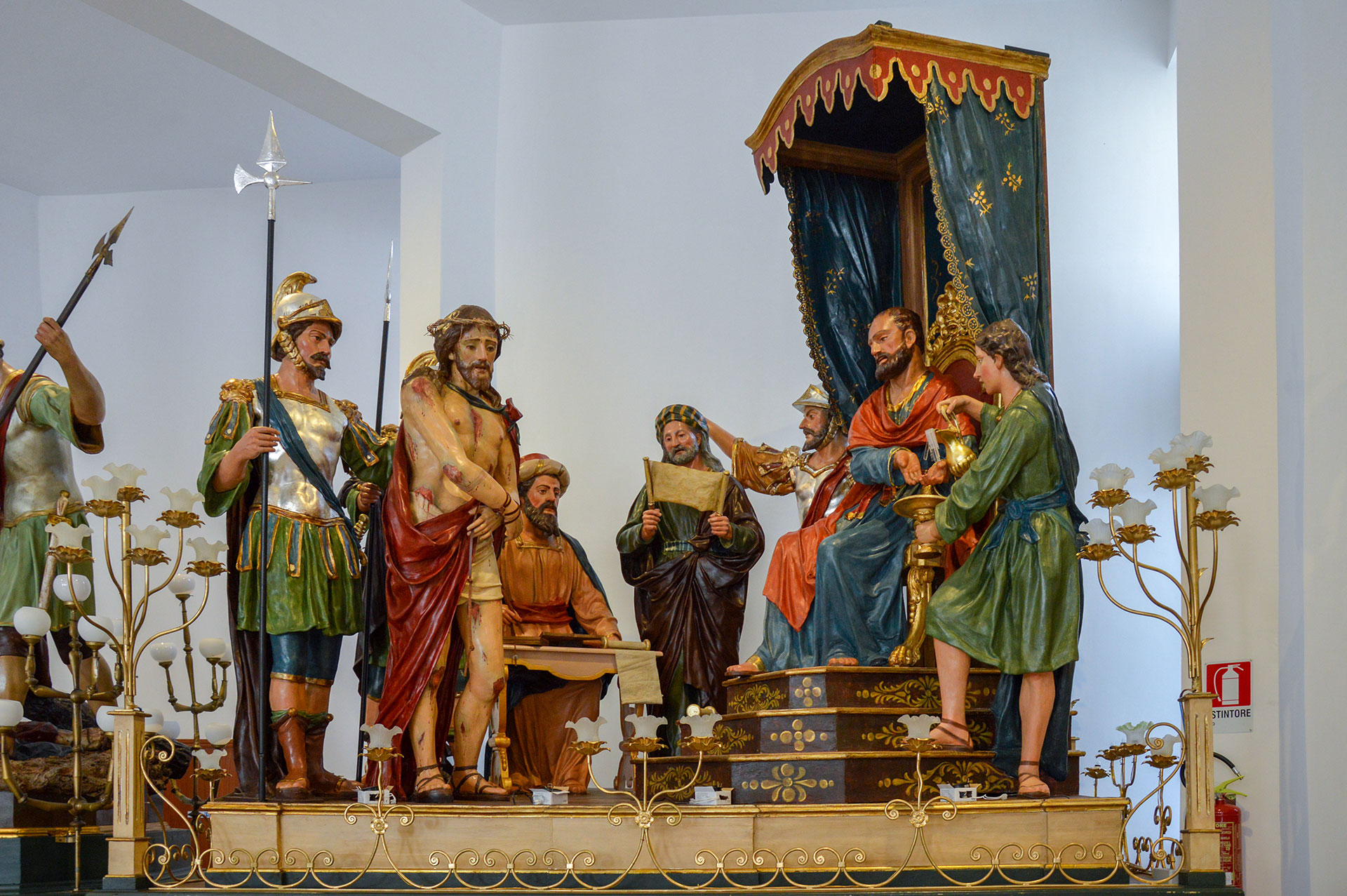 Realizzata nel 1902 da Francesco Biangardi su commissione dell’Amministrazione della Miniera Trabonella, questa vara fu oggetto di diversi interventi di restauro nel corso del tempo, in particolare nel 1933, 1947 e 1951.Il gruppo sacro, di grandi dimensioni (circa 3,70 × 2,40 × 3,50 metri), raffigura Cristo, sanguinante e legato come un malfattore, mentre viene presentato al giudizio di Ponzio Pilato, sotto la sorveglianza dei soldati.La scena è dominata dalla figura di Pilato, colto nell’atto simbolico di lavarsi le mani, gesto con cui esprime la propria volontà di non assumersi la responsabilità della condanna, pur riconoscendo l’innocenza di Gesù.L’insieme restituisce un momento di forte tensione morale e drammatica, evidenziando il contrasto tra giustizia e opportunismo.Oggi la vara è affidata al ceto “Unione Titolari Tipografi”.