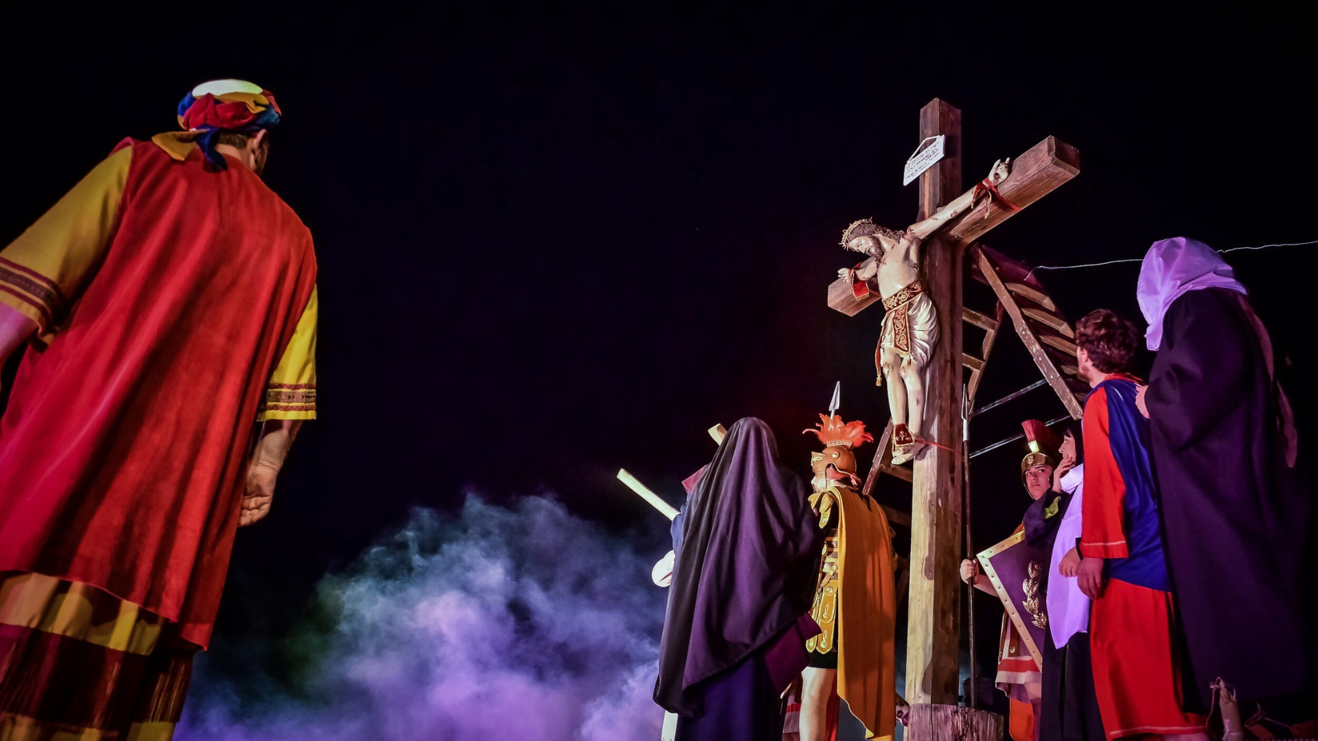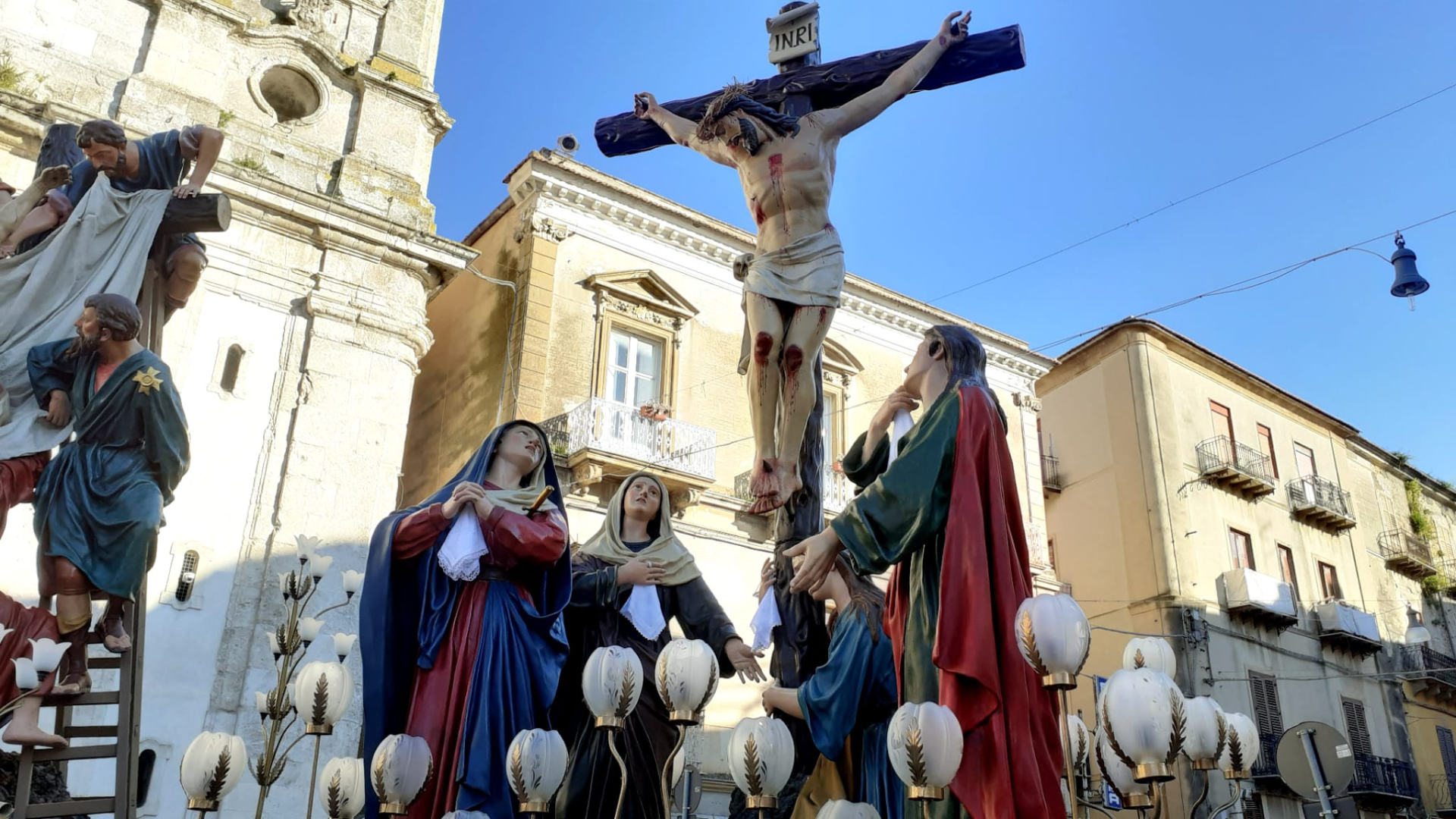 Il ciclo delle sacre rappresentazioni ha inizio il Lunedì Santo, con l’ingresso di Gesù a Gerusalemme e l’Ultima Cena, prosegue il Martedì Santo con il Processo, la Via Crucis e la Deposizione, e si conclude la Domenica di Pasqua. Diversamente da quanto avviene in città come Trapani e in molte altre realtà italiane e spagnole, a Caltanissetta il Venerdì Santo non è caratterizzato dalla processione dei Misteri. Il fulcro della giornata è invece il suggestivo Crocifisso gotico, simbolo della devozione cittadina e dedicato al patrono, noto come “Signore della città”.Si tratta della più antica scultura sacra locale, realizzata in legno scuro e portata in processione a spalla dai fogliamari, tradizionali raccoglitori di erbe spontanee. Questi avanzano scalzi, accompagnando il corteo con antichi canti popolari carichi di pathos, conosciuti come ladate o lamentazioni. Il Crocifisso, collocato su una vara barocca dorata dalla forma di corona, è preceduto dalla Real Maestranza, dalle autorità civili e religiose, dalle confraternite cittadine e da numerosi fedeli, molti dei quali partecipano anch’essi a piedi nudi, in segno di devozione.